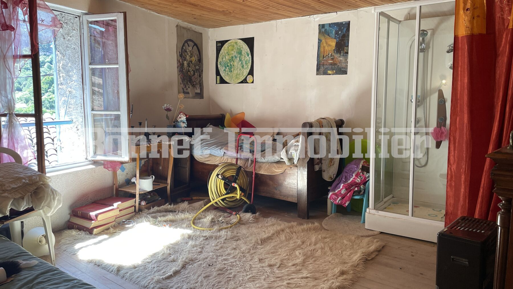 Cette maison comprend au rez-inférieur, une pièce de vie ouverte avec coin cuisine, ainsi qu’une chambre. Au rez-de-jardin, deux chambres, dont une avec douche, donnent accès au jardin et à une terrasse ombragée par un majestueux tilleul.